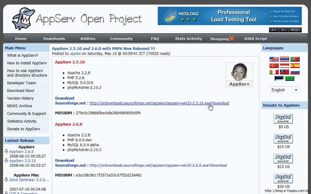 AppServ 是一個免費的軟體套件,可以到官網直接下載最新版本的軟體。