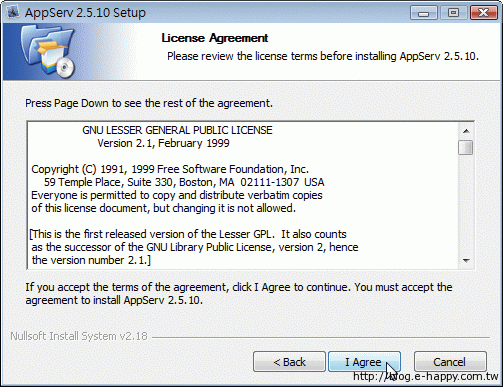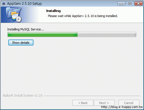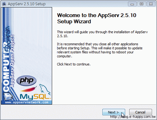 執行 <appserv-win32-2.5.10.exe>,開始安裝 AppServ 套件: