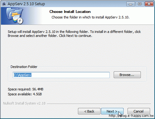 3. 這是要指定軟體的安裝路徑,預設位置是「C:\AppServ」,此處不作變更,請選按 Next 鈕。