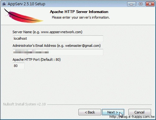 5. 請填寫主機名稱「localhost」。 輸入系統管理者的電子信箱。 輸入瀏覽器的埠位,預設值是「80」,此處不作變更。 按 Next 鈕。