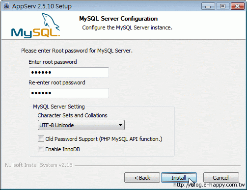 6. 請輸入管理密碼。 再重複輸入一次剛剛的密碼。 選擇 MySQL 伺服器的編碼方式為 UTF-8 Unicode。 按 Install 鈕。