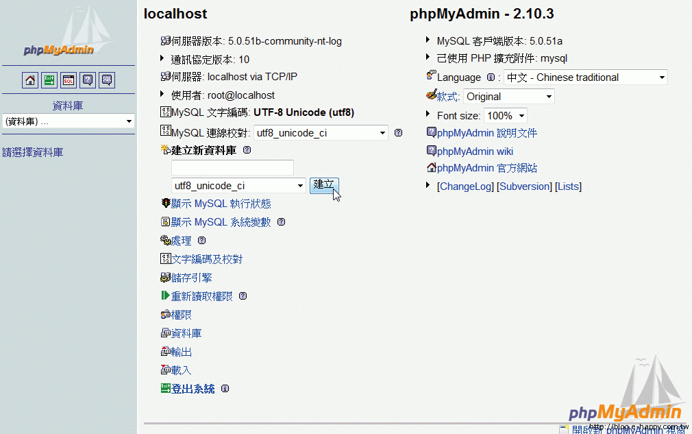 您可以在歡迎畫面選按最上方的 phpMyadmin Database Manager Version 2.10.3,或於網址列輸入「http://localhost/phpmyadmin」進行瀏覽,此時會顯示登入的窗口,輸入 MySQL 的帳號、密碼後即可進入 phpMyAdmin 管理畫面。